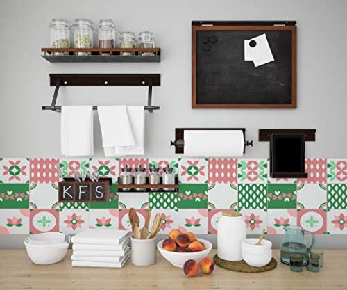 Planche de 9 Adhésif Carrelage - décoration de carreaux - 63 pièces plastifié en mat - mosaïque rose et vert - format 25x25cm par pièce